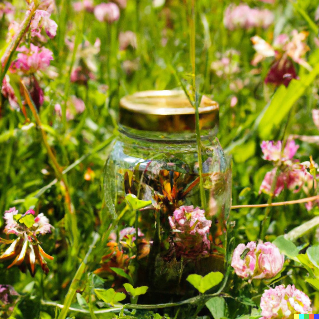 Buzzings vibrate through hot glass against my fingers. I turn my jam jar upside down. Wasps rise and tap their heads against the solid glass bottom. Their narrow wings beat and their pointy faces butt against boundaries they cannot see. I edge the lid open, add a few clover heads and buttercups, set the jar upright and watch. One or two now bang their heads against the lid. More turn, attracted to the flower heads. I put the jar down beside me in the long grass.